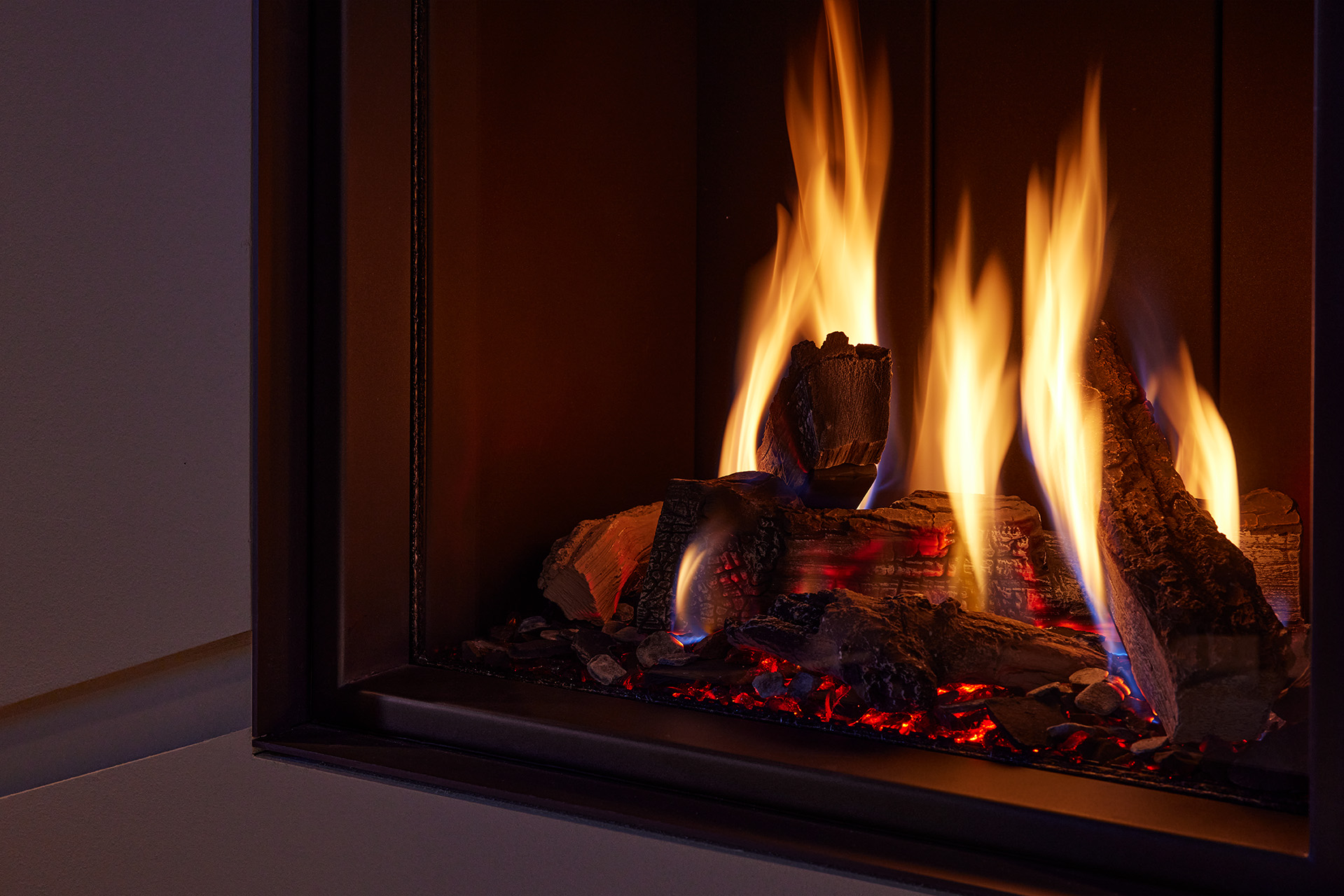 The Trimline 55XH built-in fire is the first vertical model in the range and is 1.10 meter high. This appliance will certainly create a statement piece in any home. The standard version has a burner bed made of high definition logs and is equipped with a double burner. There is also an option to include a built-in LED bed to add even more ambiance.